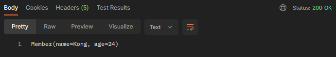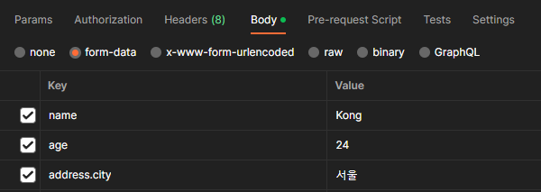 위와 같이 Member 클래스가 있고 name과 age 필드를 가지고 있다. 이 두 값을 바인딩하기 위해서 포스트맨으로 multipart/form-data 형식으로 name과 age 값을 요청으로 보냈다.