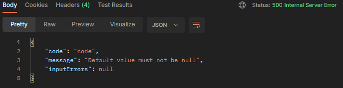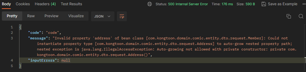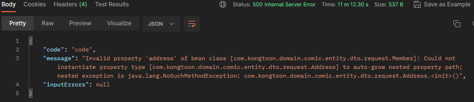 Postman을 사용하여 다음과 같이 요청을 보냈지만 바인딩에 실패하고 에러가 발생했다.
