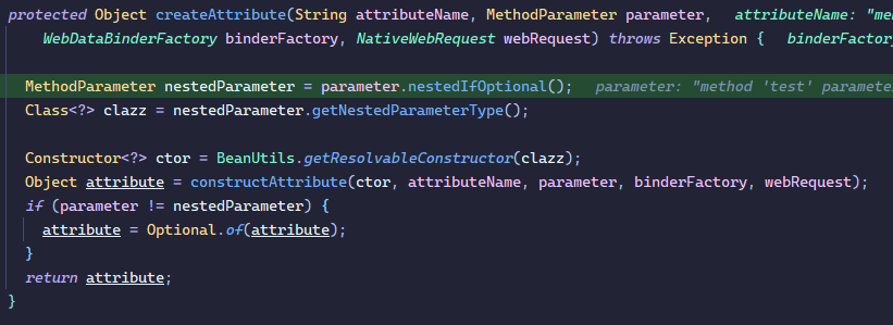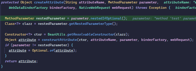 우선 ModelAttributeMethodProcessor의 createAttribute() 메소드를 호출한다. 그 다음clazz에 바인딩하려는 객체의 타입을 넣고 ctor에 해당 객체의 생성자를 넣는다.