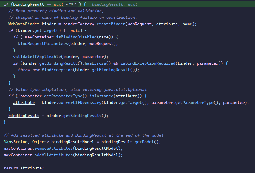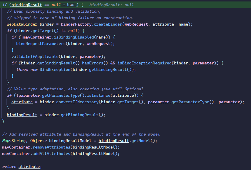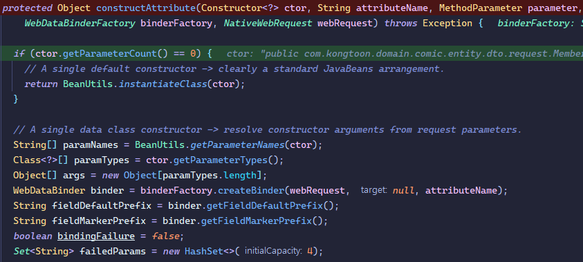 그 다음 constructAttribute() 메소드를 수행하는데 기본 생성자라면 모든 필드값이 null인 인스턴스를 반환하고 인자가 있는 생성자라면 요청값을 확인하여 요청값과 이름이 같은 필드를 바인딩한 인스턴스를 생성하여 반환한다. 예를 들어, Member 클래스에 @AllArgsConstructor가 있고 요청에 name과 age가 정상적으로 보내졌다면 Member(name=XXX, age=YYY)인 인스턴스가 반환된다.