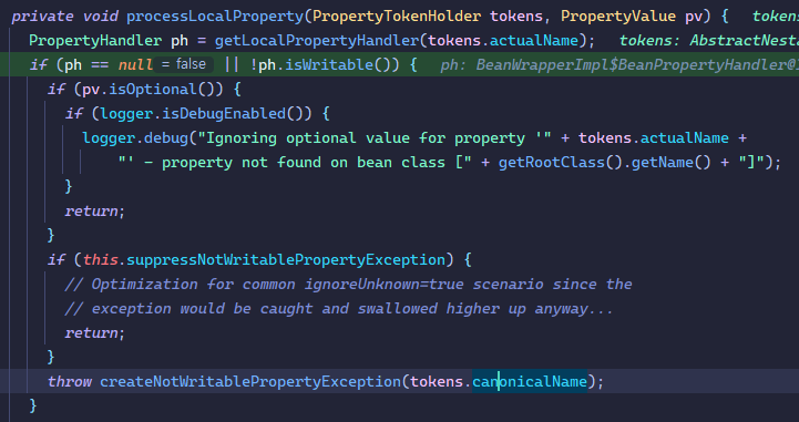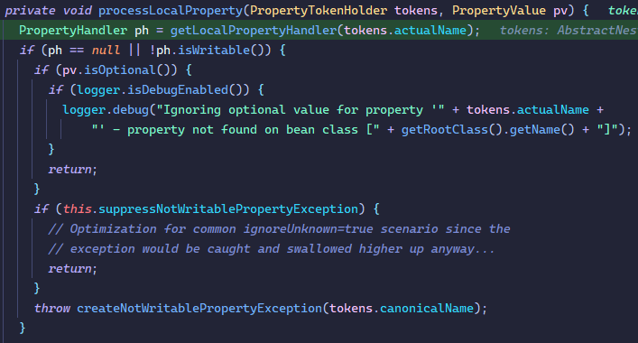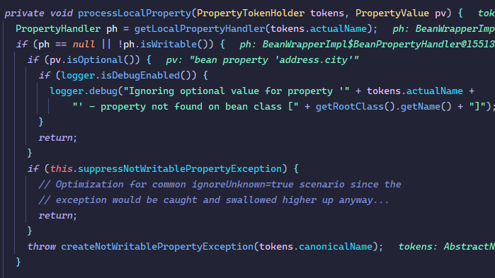 이어서 setPropertyValue()를 호출해서 Member.Address에 PropertyValue(name=address, value=Address(city=null))을 이용하여 실제 바인딩 작업을 거치는데 해당 코드를 보면 ph는 Address타입이라는 내용을 담고있고 ph에 Setter가 없다면 바인딩 작업 없이 return을 반환하는 것을 알 수 있다.