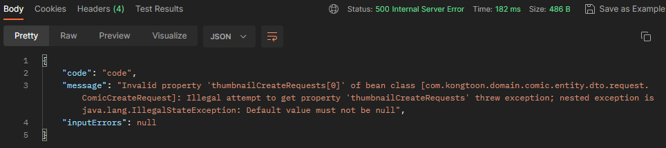 ComicCreateRequest, ThumbnailCreateRequest를 record타입에서 일반 클래스로 만들고 ComicCreateRequest에 Getter, Setter, 기본생성자를, ThumbnailCreateRequest에 Setter와 기본생성자를 정의했다.