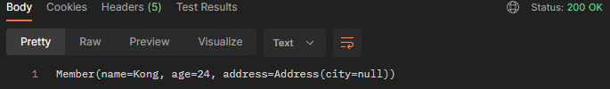 여기서 잘 보면 생성자의 파라미터와 요청으로 들어온 데이터의 값을 매핑하는 기준은 생성자 파라미터의 이름과 요청의 키값이다. 앞서 포스트맨으로 요청을 보낼 때 중첩 프로퍼티 객체의 필드 값을 바인딩하기 위해 address.city라는 키값으로 요청을 보냈다. 그리고 생성자의 파라미터 이름은 address이다. 따라서 바인딩하고자 했던 Member.Address.city는 생성자를 통해 바인딩 되지 않는다.