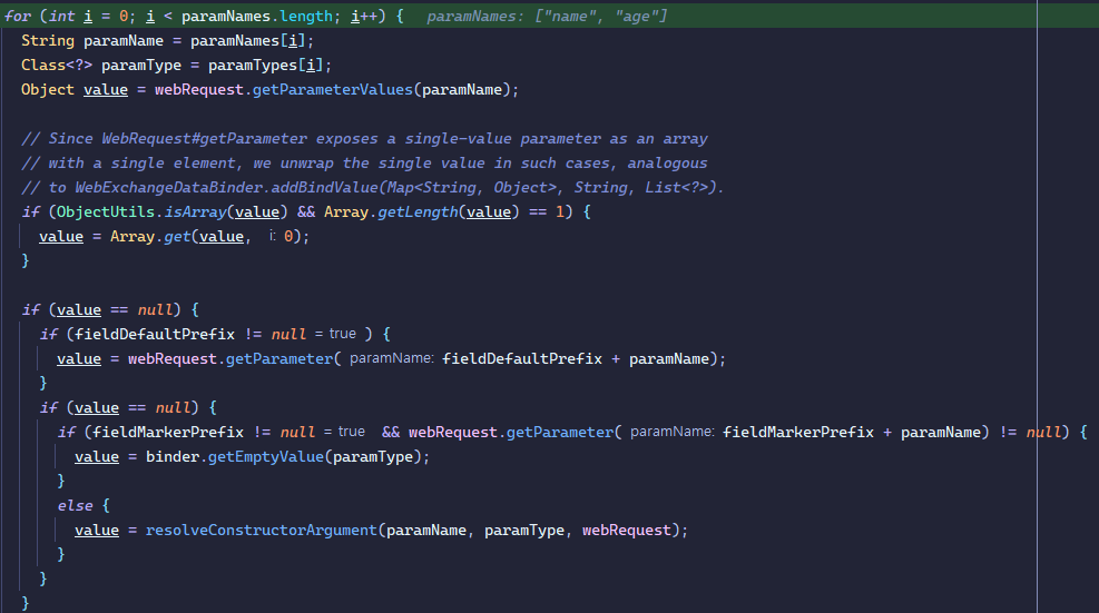 그리고 for문을 돌면서 생성자 파라미터의 이름과 일치하는 사용자 요청의 값을 찾는다.