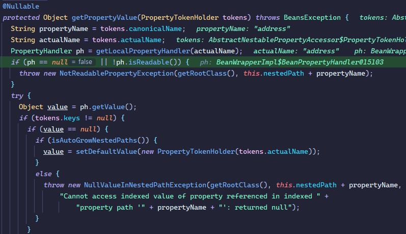 계속 따라 들어가면 getPropertyValue() 메소드가 나오는데 이 메소드를 살펴보면 address라는 이름으로 PropertyHandler값을 구했을 때 Getter가 없다면, 즉 Member.getAddress()가 없다면 NotReadablePropertyException을 던지는 것을 확인할 수 있다.
