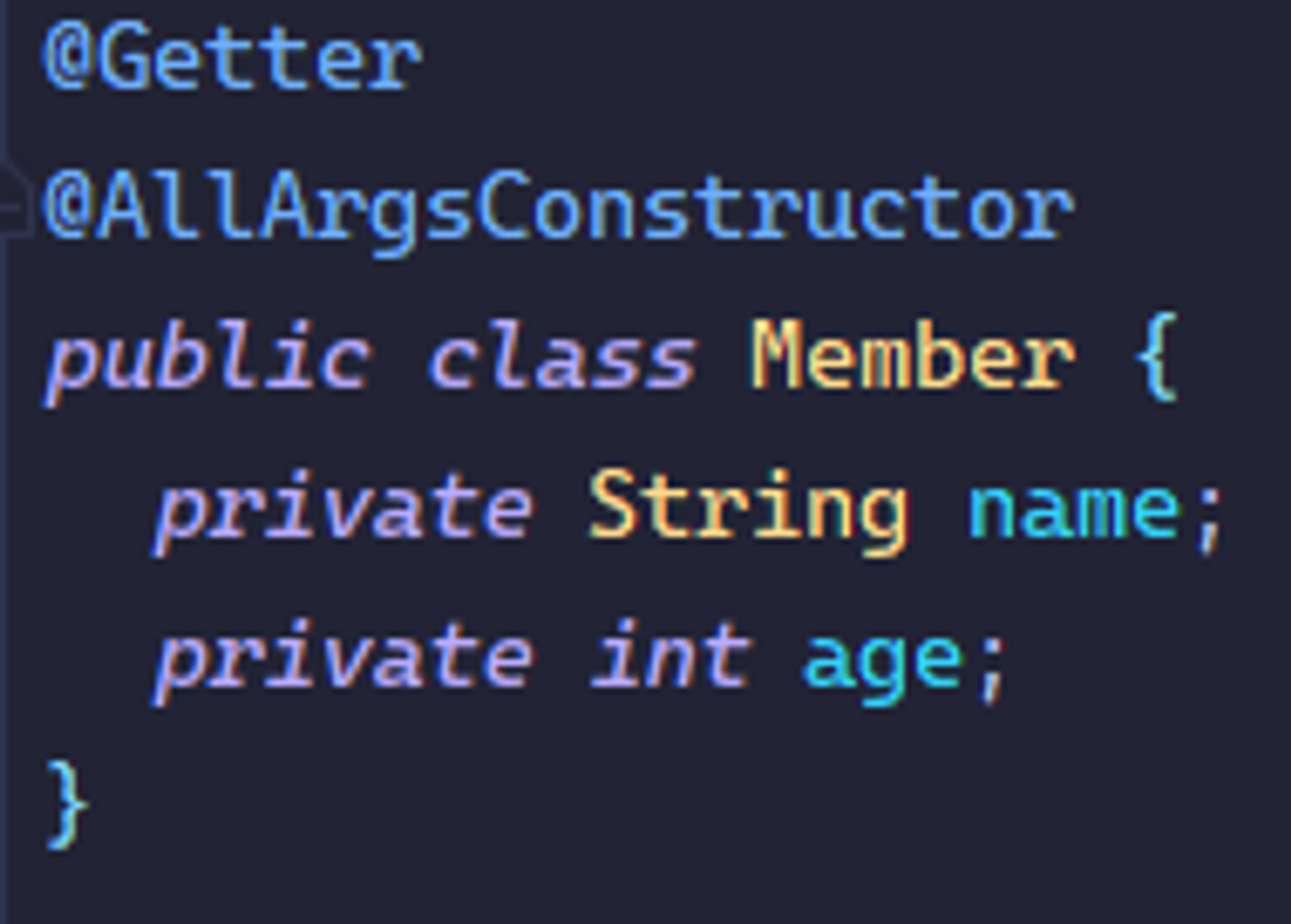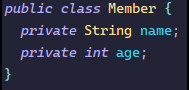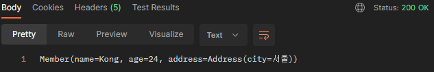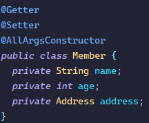 그리고 Member클래스 내부에 Address를 필드로 갖고 있다. 이때 모든 필드값을 인자로 갖는 생성자, Getter, Setter를 모두 정의한다.