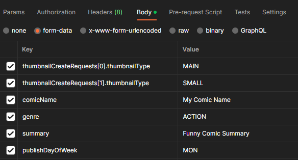 ComicCreateRequest(comicName=My Comic Name, genre=ACTION, thumbnailCreateRequests=[ComicCreateRequest.ThumbnailCreateRequest(thumbnailType=MAIN), ComicCreateRequest.ThumbnailCreateRequest(thumbnailType=SMALL)], summary=Funny Comic Summary, publishDayOfWeek=MON)