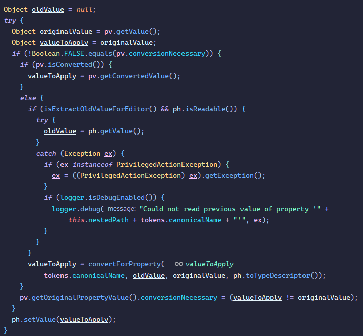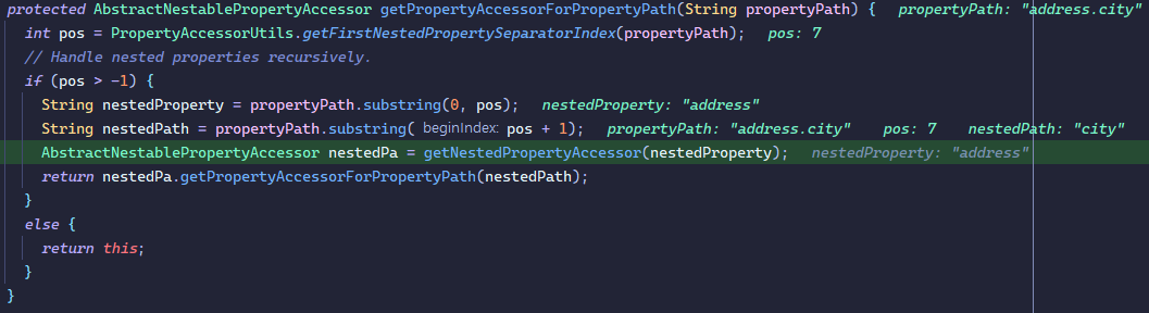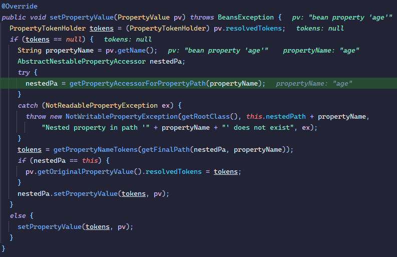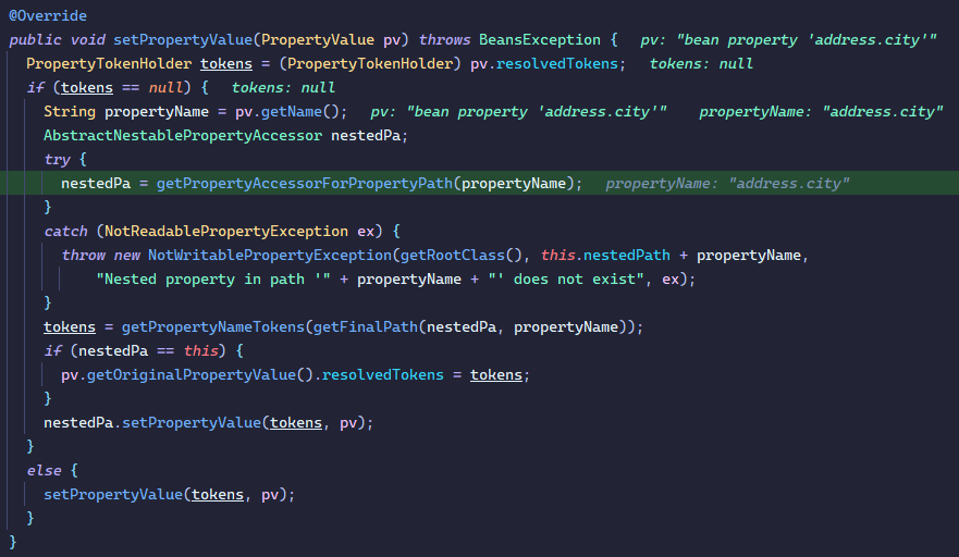 AbstractNestablePropertyAccessor.setPropertyValue() 메소드는 nestedPa변수에 값을 할당하는데 이 변수는 getPropertyAccessorForPropertyPath() 메소드를 호출함으로써 할당된다.