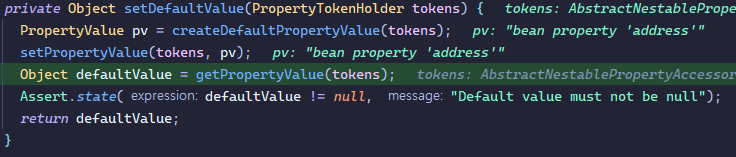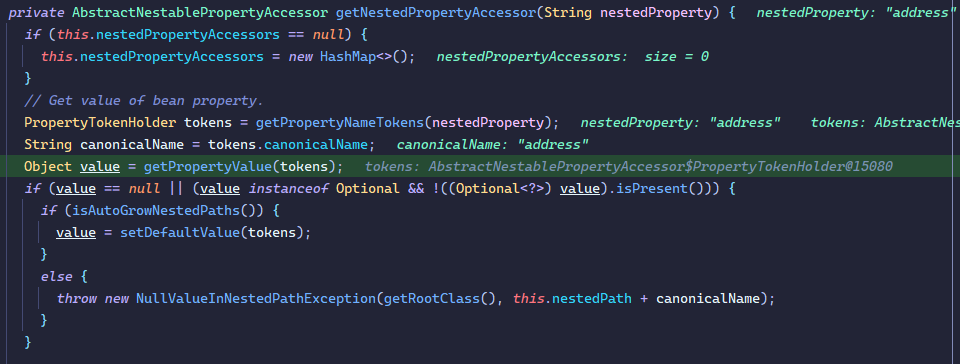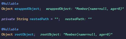 바인딩에 성공했다면 다시 setDefaultValue()로 돌아와서 getPropertyValue()를 호출하는데 이는 Member인스턴스에서 address필드 값을 가져온다. 앞서 중첩 프로퍼티 객체 바인딩에 성공했으므로 defaultValue에는 Address(city=null)가 할당된다.