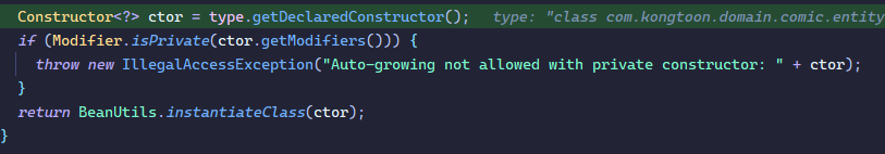 → 기본생성자가 없거나 private 생성자인 경우 에러가 발생했다.