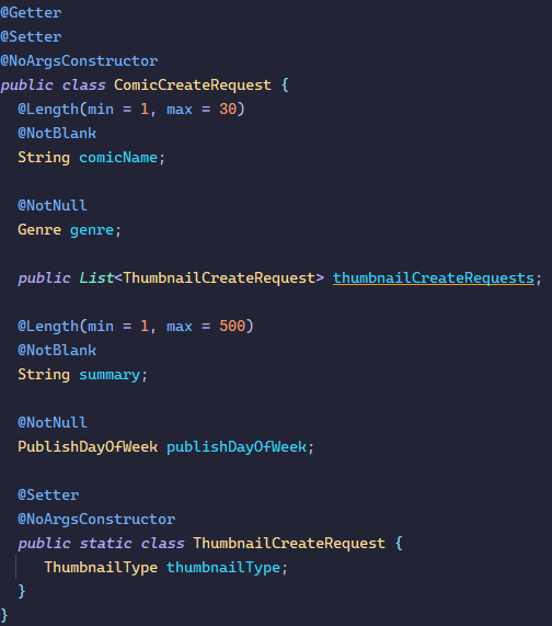 위와 같이 @ModelAttribute를 사용하여 클라이언트에서 요청을 받아 ComicCreateRequest를 바인딩하고자 했다. 그리고 ComicCreateRequest는 다음과 같다.