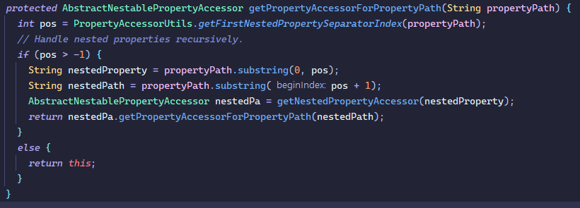 여기서 getPropertyAccessorForPropertyPath() 메소드를 들어가면