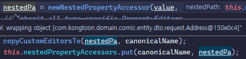 실제로 코드를 계속 진행하면 기존까지 AbstractNestablePropertyAccessor nestedPa의 wrapping object가 Member타입이었는데 이후에는 Address 타입으로 바뀐다.
