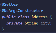 우선 다음과 같이 Address클래스를 만들고 기본생성자와 Setter를 정의한다.