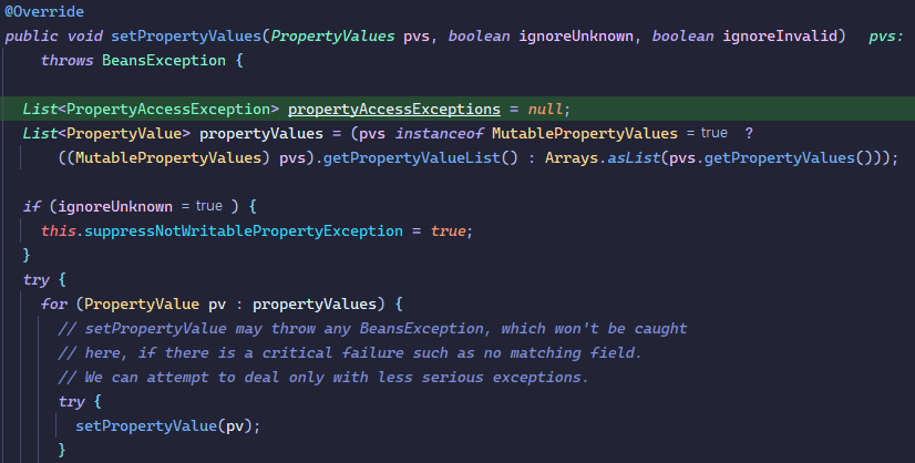 메소드를 진행하면 setPropertyValues()를 호출하는데 여기서 mpvs의 propertyList를 하나씩 돌면서 setPropertyValue() 메소드를 실행한다.