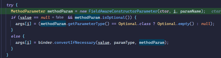 그리고 MethodParameter는 생성자의 파라미터에 대한 정보(이름, 타입 등)를 담고 있고 생성자의 인자 타입으로 변환이 필요하다면 타입을 변환하고 args[] 배열에 담는다.